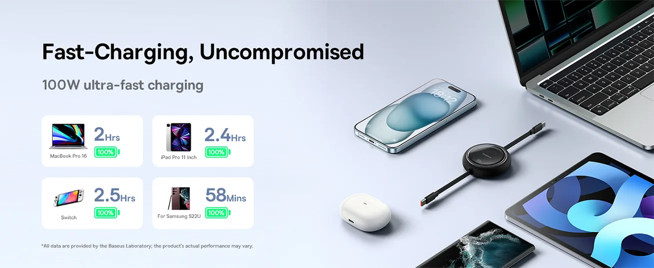 60W Retractable USB C Fast Charging  Baseus 100W retractable USB C to USB C charger cable has PD 3.0 and QC 3.0 fast charging technology, supports up to 100W (20V/3A) output with USB-C power delivery adapters such as 30W/45W/60